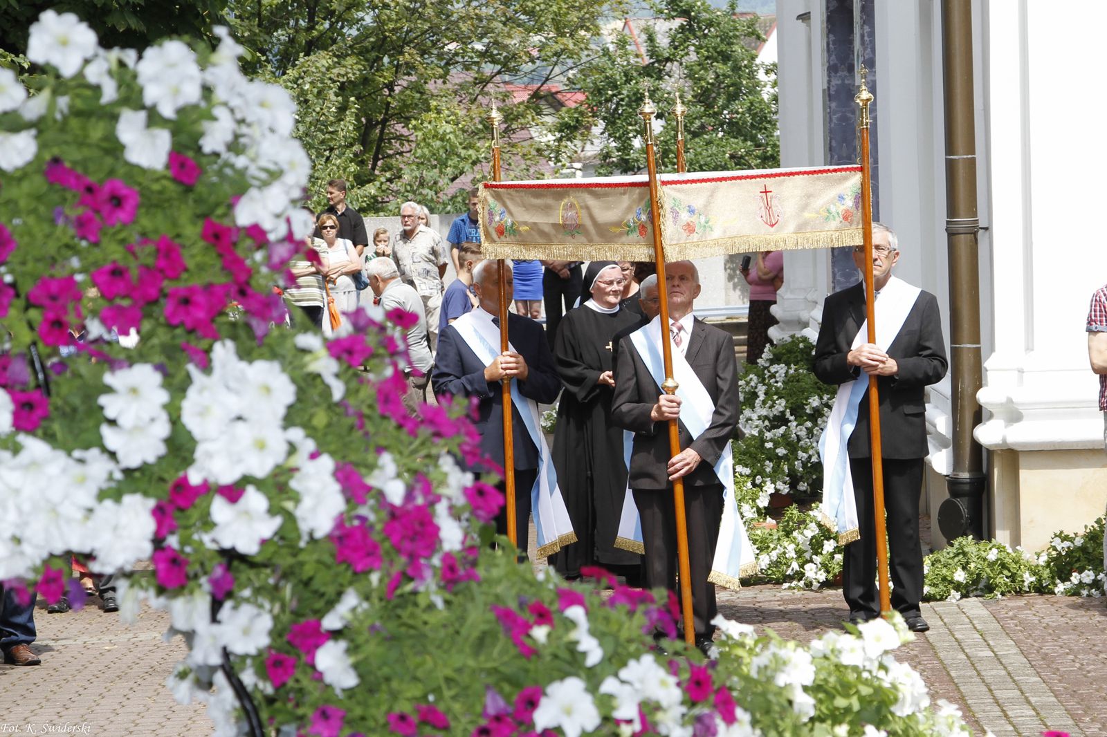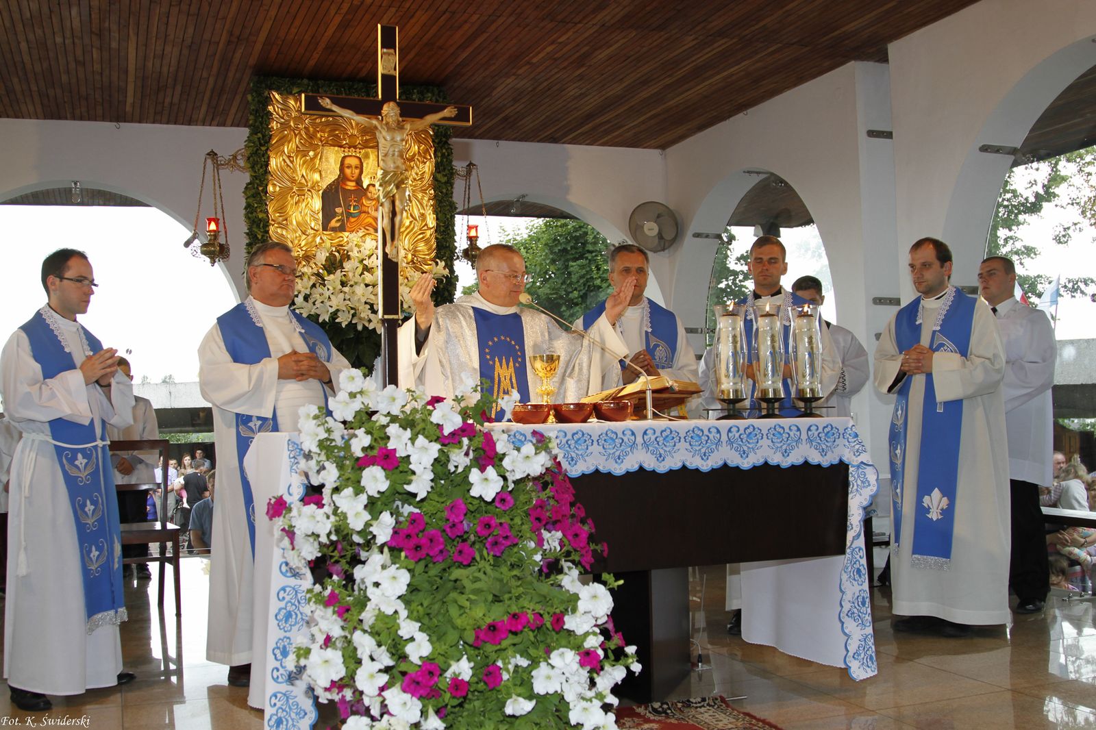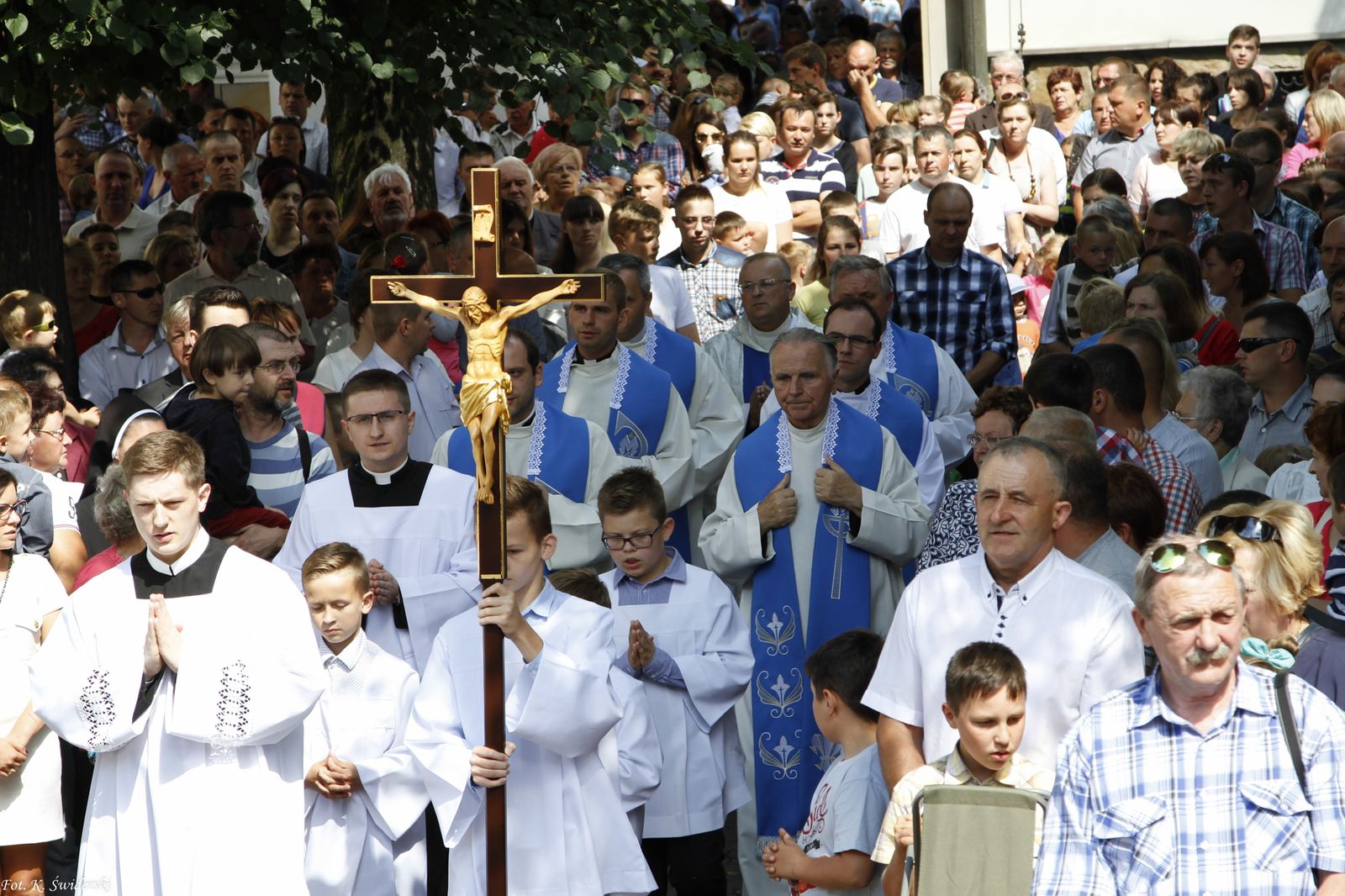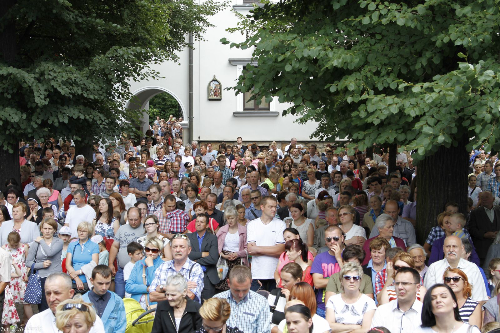 Uroczystej sumie o godzinie 11.00 przewodniczył ks. prałat Franciszek Kuczek – dziekan dekanatu tuchowskiego. Homilię wygłosił ks. prałat Alfons Górowski. Na początku odniósł się on do tegorocznego tematu odpustu: „Chcemy z Matką sięgać po nowe życie, to życie Boże w sobie umacniać”. To, że na lipowe wzgórze przybywa tak dużo ludzi, świadczy o tym, że chcemy czegoś więcej w życiu duchowym i moralnym. W kazaniu ks. Alfons nawiązywał do ostatniej adhortacji papieża Franciszka – Amoris laetita, która doskonale korespondowała z tematem dnia. „W ten współczesny świat, tak różnorodny, tak z jednej strony wspaniały i tak też zagubiony, pełen zakamarków, do których czasem nie dochodzi światło, wchodzi Piotr naszych czasów (…) mówiąc, że człowieka z grzechów należy leczyć miłością”. Papież dostrzega dobro ukryte w innych, obraz Boga w każdym człowieku, tak jak tego chce Chrystus. Doświadczenie cierpienia w życiu człowieka nie jest „pomyłką Pana Boga”, ale doświadczeniem człowieka, który wziął na siebie skutki grzechu pierworodnego i z ufnością w miłosierdzie realizuje swoje powołanie. „To nie brak grzechu, ale umiejętność podniesienia się z niego w dążeniu do pełnego zjednoczenia się z Bogiem stanowi dopiero o świętości człowieka”. Orędzie Kościoła o małżeństwie i rodzinie jest wyraźnym i jasnym odzwierciedleniem nauczania Jezusa, który nigdy nie traci cierpliwości wobec grzesznych i słabych. Małżeństwo to nie tylko pewien rytuał, ale znak uświęcenia i zbawienia małżonków. Jeżeli małżonkowie przyjmą swój krzyż, staje się on ciężarem lekkim, brzemieniem słodkim. „Patrząc na kolejki przy konfesjonałach (…) wychwalamy miłosierdzie Pana. Widzimy Jezusa, który pochyla się nad grzesznikami”. Kapłani nie są tylko kontrolerami łaski, urzędem celnym, ale ojcowskim domem. Kaznodzieja zaznaczył, że powinniśmy się troszczyć o modlitwę o powołania kapłańskie, by nie brakowało również tych, którzy dla Królestwa Bożego zostają bezżenni. Dużo dobra wnoszą w nasze życie różne inicjatywy działające przy parafii, wspierające rodzinę i jej rozwój. Nauka papieża, jak wspomniał ks. prałat, powinna być dla nas inspiracją do ożywienia miłości.