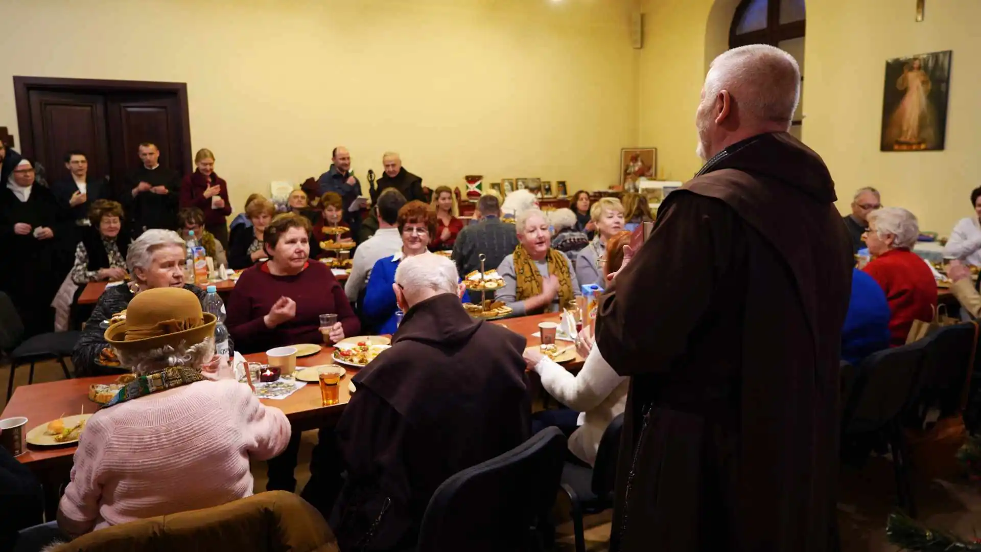 Po Eucharystii wszyscy spotkali się w sali św. Anny na wspólnym kolędowaniu animowanym przez p. Janusza oraz dzieleniu się opłatkiem przy dźwiękach kolęd z płyt gramofonowych. Uczestnicy spotkania mogli skosztować poczęstunku przygotowanego przez p. Piotra, klasztornego kucharza, oraz jego małżonkę.