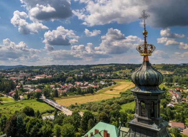 Redemptoryści: Nowy krzyż, kula i korona na wieży sanktuarium w Tuchowie