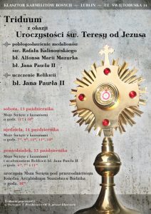 Przygotowaniem do podniosłej ceremonii pobłogosławienia płaskorzeźb, a przede wszystkim do intronizowania Relikwii Krwi Ojca Świętego – mówi przeor klasztoru – będzie triduum, które rozpocznie się już w sobotę, 13 września o godz. 11.30. Zostaną przedstawione duchowe związki Papieża z Karmelem oraz sylwetki wspomnianych naszych współbraci oraz duchowe przesłanie św. Teresy od Jezusa, którą Jan Paweł II nazywał „mistrzynią modlitwy i cnoty”, a gdy podczas pierwszej pielgrzymki apostolskiej do Hiszpanii celebrował Mszę św. w jej rodzinnym mieście, Avila, wyznał, że przybył tam, „aby umocnić więzy pobożności ze świętymi Karmelu, w których podziwia mistrzów swojego życia wewnętrznego”.