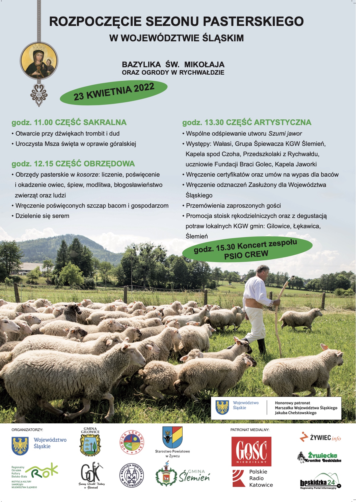 W sobotę 23 kwietnia w Rychwałdzie koło Żywca przy dźwiękach trombit i dud uroczyście rozpocznie się sezon pasterski w województwie śląskim. Święto beskidzkich pasterzy składać się będzie z trzech części: sakralnej, obrzędowej i artystycznej.