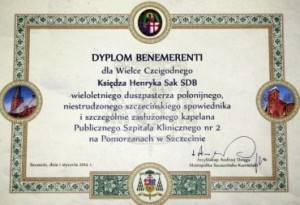 W dniu 1 stycznia 2014 r. ks. abp Andrzej Dzięga, Metropolita Szczecińsko-Kamieński, wręczył wyróżnienie Benemerenti naszemu współbratu Księdzu Henrykowi Sakowi.
