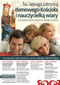 Tegoroczne uroczystości odpustowe w Międzynarodowym Sanktuarium św. Jadwigi Śląskiej w Trzebnicy będą trwały w dniach od 12 do 16 października. Przeżywane będą pod hasłem: „Św. Jadwiga patronką domowego Kościoła i nauczycielką wiary”, którego treść nawiązuje do  myśli przewodniej roku duszpasterskiego: „Kościół naszym domem – diecezja rodziną” oraz do ogłoszonego przez Benedykta XVI Roku Wiary.