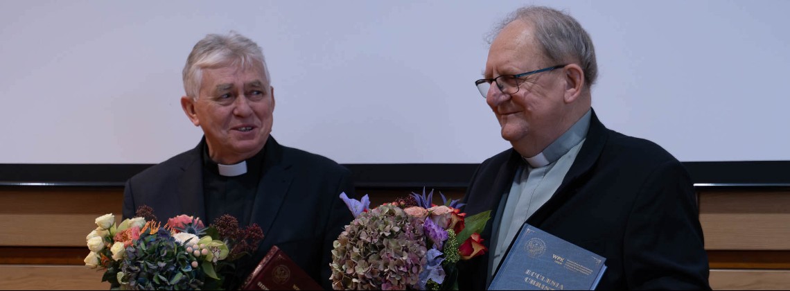 – To tutaj, na naszym Uniwersytecie, profesorowie, którzy całe swoje życie zawodowe związali z Wydziałem Prawa Kanonicznego ATK, a później UKSW, przeszli wszelkie szczeble awansu naukowego aż do uzyskania tytułu naukowego profesora. Obaj Profesorowie byli prodziekanami, a później dziekanami Wydziału Prawa Kanonicznego, a także senatorami naszej Uczelni – mówił prorektor ds. nauki i współpracy międzynarodowej ks. dr hab. Marek Stokłosa. – Chciałbym, w imieniu Jego Magnificencji Księdza Rektora podziękować czcigodnym profesorom za ogromny wkład w rozwój Wydziału Prawa Kanonicznego, za wszelkie wyświadczone przez Was dobro, które stało się udziałem wspólnoty akademickiej – dodał Prorektor.