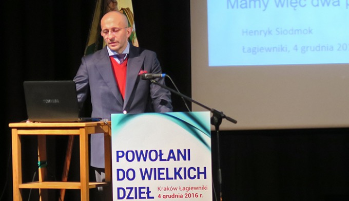 Z bazyliki pielgrzymi udali się do auli im. św. Jana Pawła II. Tam zostali powitani przez koordynatora Duszpasterstwa TALENT ks. Grzegorza Piątka SCJ. Po odmówieniu modlitwy przedsiębiorcy i pracodawcy zebrani usłyszeli przesłanie metropolity wrocławskiego abp. Józefa Kupnego skierowane do uczestników pielgrzymki. Zaznaczył w nim, że „talentem, który otrzymaliśmy od Boga i który mamy pomnażać, jest przede wszystkim zdolność do czynienia dobra”. Prowincjał Księży Sercanów w swoim wystąpieniu nawiązał do tradycji Zgromadzenia, które od samego zarania troszczyło się o formację religijno-społeczną robotników i przedsiębiorców. Prowadzone obecnie Duszpasterstwo TALENT wpisuje się w dorobek Zgromadzenia na polu społecznym. Głównym punktem spotkania w auli Jana Pawła II był wykład prezesa Grupy ATLAS dr. Henryka Siodmoka, który starał się odpowiedzieć na pytanie „Czy przedsiębiorca może zostać świętym?” W opinii znamienitego gościa jest możliwe, jeśli przedsiębiorca wykorzysta swój najważniejszy talent, jakim jest zdolność brania odpowiedzialności za prowadzenie firmy i dawanie chrześcijańskiego świadectwa wobec ludzi związanych z przedsiębiorstwem. Ponadto, mówca podkreślił wielką i niezastąpioną rolę przedsiębiorców – zwłaszcza prowadzących małe i średnie firmy – dla rozwoju Polski. Postawił tezę, że przedsiębiorca zasługuje na wielostronne wsparcie zez strony państwa i Kościoła.