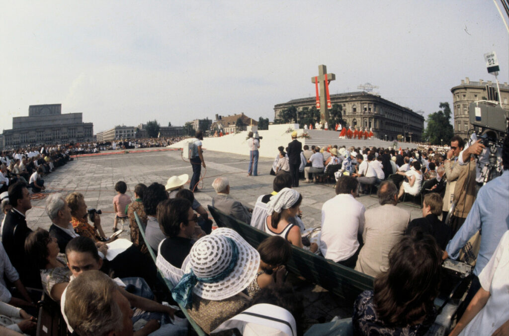 Krzyż papieski stał przed kościołem. To element ołtarza papieskiego z pierwszej pielgrzymki Jana Pawła II do Polski (2 czerwca 1979 r.). Wtedy stał na Placu Zwycięstwa (dziś Plac Piłsudskiego) w Warszawie, gdzie papież odprawił pierwszą Mszę św. i wygłosił słynne słowa: „Niech zstąpi Duch Twój i odnowi oblicze ziemi. Tej ziemi.” Krzyż przeniesiono później przed kościół św. Maksymiliana Kolbego (poświęcony w 1999 r.) jako pamiątkę tego wydarzenia. Był symbolem historycznego przełomu i wiary.