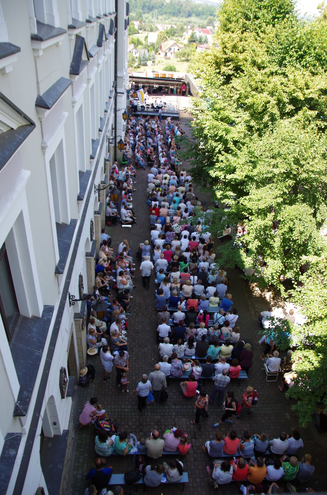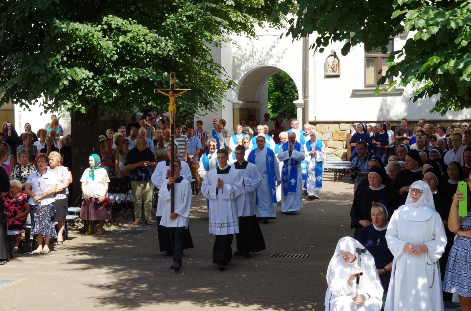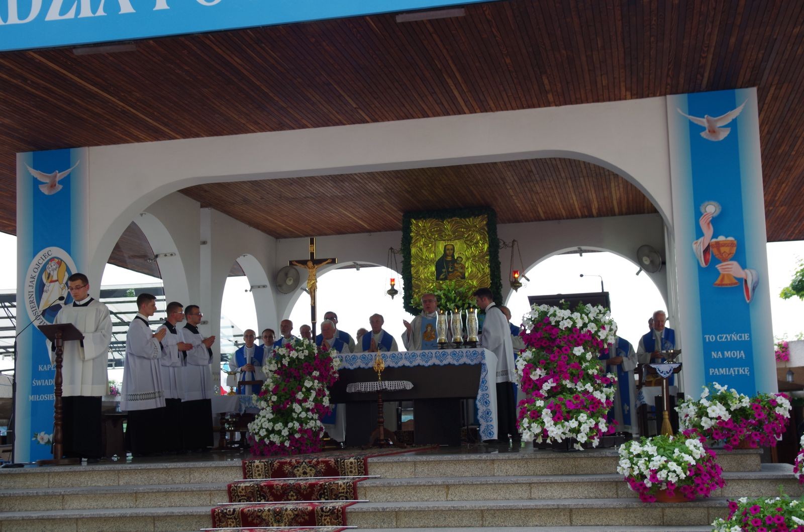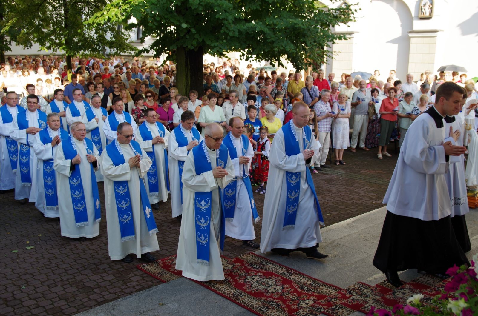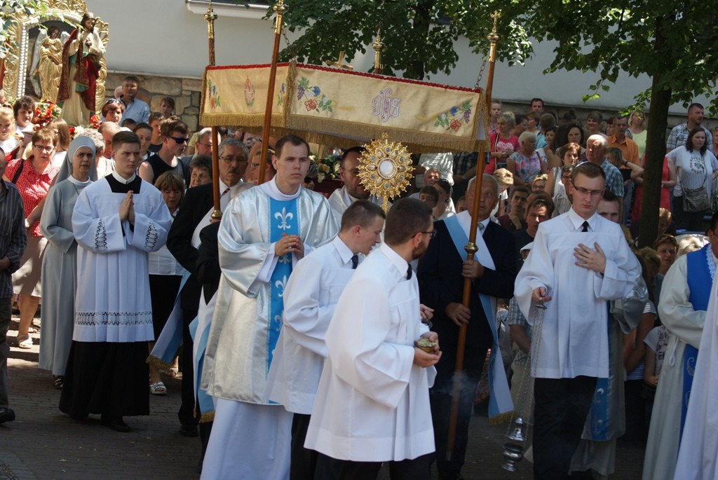 O godzinie 18.00 na placu sanktuaryjnym odbyły się nieszpory. Wieczornej modlitwie ludu Bożego przewodniczył neoprezbiter o. Arkadiusz Buszka CSsR. Po nieszporach licznie zgromadzeni wierni uczestniczyli we Mszy Świętej. Głównym celebransem i kaznodzieją na Eucharystii był ks. Jan Bartoszek – asystent diecezjalny Akcji Katolickiej i misjonarz miłosierdzia. Na początku homilii powiedział on, iż w życiu człowieka wierzącego na pierwszym miejscu po Panu Bogu jest Maryja – Matka Syna Bożego, która wraz z nim wszystko przeżywała: radości, smutki, cierpienia, szczęście. Doświadczenie Jezusa w życiu Maryi było motywem jej działań, co przejawiło się m. in. w nawiedzeniu i wspieraniu św. Elżbiety. Tak samo i my – gdy doświadczymy żywego spotkania z Jezusem, zaczynamy służyć drugiemu człowiekowi. Pierwsze takie doświadczenie odbywa się w sakramencie chrztu świętego. 1050-lecie chrztu Polski jest dla nas okazją do zweryfikowania, czy żyjemy łaską chrztu na co dzień. „Po ołtarzu i tabernakulum chrzcielnica jest najważniejszym miejscem w kościele. Przypomina ona bowiem o zobowiązaniach płynących z faktu, że zostaliśmy ochrzczeni.” „Czym jest chrzest? (…) To coś więcej, niż oczyszczenie duszy. Jest śmiercią i zmartwychwstaniem”. Mogą nas dzielić różne rzeczy: pochodzenie, kolor skóry, kontynenty… ale wszyscy mamy tego samego Pana, te same wartości nas kształtują. Wspominając chrzest Polski chcemy popatrzeć na naszą historię, aby odważniej spojrzeć w przyszłość. „Miłość jest skałą prawdziwą, na której warto budować (…) jest nierozłączna z wiarą”. Sanktuarium w Tuchowie ma piękny, owocujący rys, którym są konfesjonały. Tu się dokonuje oczyszczenie duszy, odrodzenie, unicestwienie grzechu, przywrócenie łaski chrztu. „Niewiele dadzą ceremonie – choćby piękne, stowarzyszenia – choćby dobrze działające, jeśli nie będą nastawione na wrażliwość(…)”. Kończąc, kaznodzieja powiedział, że nasza podróż przez życie pomimo wszystkich niepewności i cierpień ma pewien cel, którym jest Dom Ojca, a Maryja ma nas do Niego prowadzić. Ostatnią Mszę świętą w tym dniu zakończyła procesja wokół bazyliki.