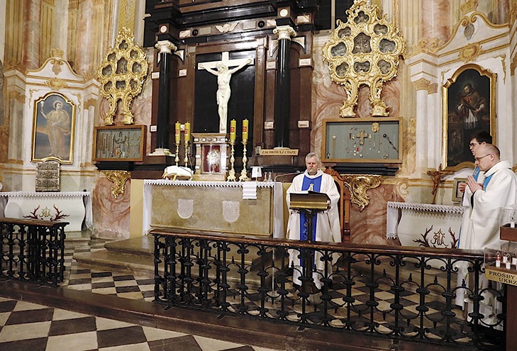 Widzimy tu za szybą, w pancernym tabernakulum, relikwiarz świętokrzyski o podwójnych ramionach, zawierający cząstki Drzewa Krzyża Świętego, zwany też karawaką. Takie krzyże stawiano przy drogach w czasie epidemii cholery, by chroniły przed zarazą. Na koniec Eucharystii będziemy pobłogosławieni tym krzyżem, który jest symbolem cierpienia i ofiary, a jednocześnie znakiem odkupienia i zbawienia, znakiem zwycięstwa Chrystusa nad śmiercią – powiedział na wstępie liturgii o. Marian Puchała OMI.