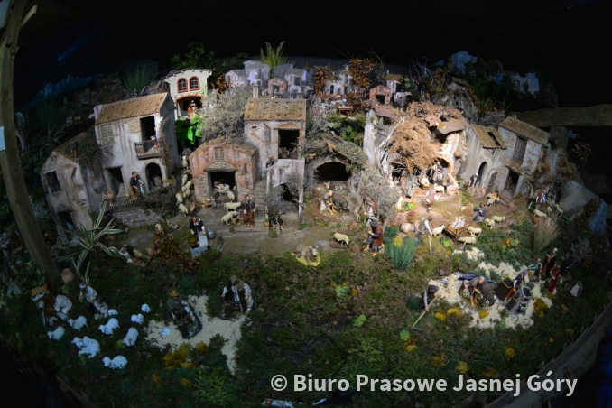 Podobnie jak w ubiegłym roku, szopka jasnogórska jest dwuczęściowa. Przed bazyliką ustawiono góralską chatę ze św. Rodziną. „Ta najważniejsza scena, do której wszyscy jesteśmy przyzwyczajeni, i której chyba każdy szuka swoim sercem i wzrokiem – to Dziecię Jezus, Maryja, św. Józef i najbliższe otoczenie zwierząt, które – jak mówimy – ogrzewały Pana Jezusa” – opisuje rzecznik prasowy Jasnej Góry o. Sebastian Matecki.