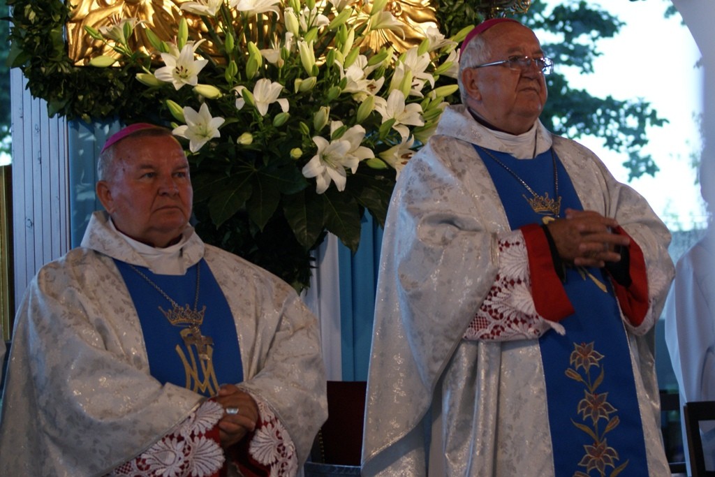 JE ks. bp Andrzej Jeż, ordynariusz diecezji tarnowskiej, przewodniczył transmitowanej przez radio RDN Małopolska i RDN Nowy Sącz Eucharystii o godzinie 11.00. Wraz z Nim Eucharystię koncelebrowali m. in. biskupi redemptoryści z Brazylii: o. Czesław Stanula i o. Marek Piątek. Ordynariusza przywitał o. Bogusław Augustowski CSsR, proboszcz i kustosz tuchowskiego sanktuarium. „Żniwo wprawdzie wielkie, ale robotników mało; proście więc Pana żniwa, żeby wyprawił robotników na swoje żniwo ” (por. Łk 10, 2) – tym cytatem z Pisma Świętego biskup Andrzej Jeż rozpoczął homilię. Celem naszego życia jest zbawienie. Na uprawnej roli Królestwa Bożego – Kościoła liczy się każdy człowiek. „To jest najważniejsze, żeby każdy człowiek, który stoi na tym placu był zbawiony”. Męka Chrystusa ukazała jak ważny dla Boga jest każdy człowiek. Logika rządząca Królestwem Bożym, to miłosierdzie Boże. Tu w Tuchowskim sanktuarium, gdzie tak wiele jest konfesjonałów, wypełnionych penitentami, tym bardziej jest to widoczne. Biskup poruszył tez kwestię cierpienia, które w perspektywie krzyża Chrystusa zmienia nasz sposób patrzenia na życie, z Niego wyrasta dobro i piękno. Następnie przypomniał tegoroczne hasło roku duszpasterskiego: „Nowe Życie w Chrystusie”, które nawiązuje do 1050. rocznicy chrztu Polski. „Pamiętajmy, że Bóg jest większy, On jest Panem historii”, a nie nasze słabości, grzechy, lęki, czy obawy. Tak jak uczniowie posłani przez Jezusa, my również mamy kroczyć za Nim z zaufaniem i odwagą. „Zawsze trzeba przejść przez ciemną dolinę ku słońcu, którym jest Jezus Chrystus”. Czas Kościoła, to czas naszego posłania, aby dawać świadectwo Chrystusowi i Ewangelii. Jako ochrzczeni mamy być świadkami nowego życia, życia w Chrystusie. „Dla Boga ważny jest każdy człowiek”, przypomniał po raz kolejny tę ważną prawdę biskup. I w dziele ewangelizacji trzeba się po każdego schylić. Znakiem niezawodnej nadziei jest dla nas także Matka Boża. Ona wskazuje nam Drogę, którą jest Chrystus. Przybywamy tu jako dzieci Boże, dzieci Maryi, by się do Niej przytulić, ucałować Jej dłoń, poczuć się bezpiecznie, z nadzieją spojrzeć w przyszłość, poczuć się kochanym. Biskup Andrzej homilię zakończył słowami modlitwy jubileuszowej skierowanej jako prośba do Matki Bożej.