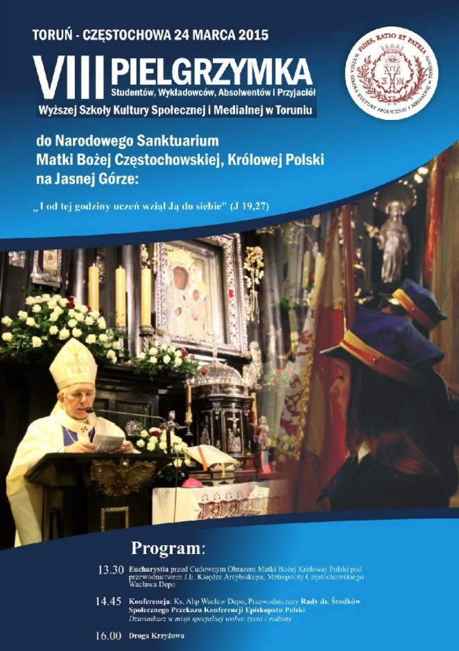 radiomaryja.pl„I od tej godziny uczeń wziął Ją do siebie” – pod takim hasłem w wigilię Dnia Świętości Życia, czyli już 24 marca – studenci, wykładowcy, absolwenci i przyjaciele Wyższej Szkoły Kultury Społecznej i Medialnej w Toruniu, jak co roku będą pielgrzymować na Jasną Górę przed Cudowny Obraz Matki Bożej Królowej Polski.