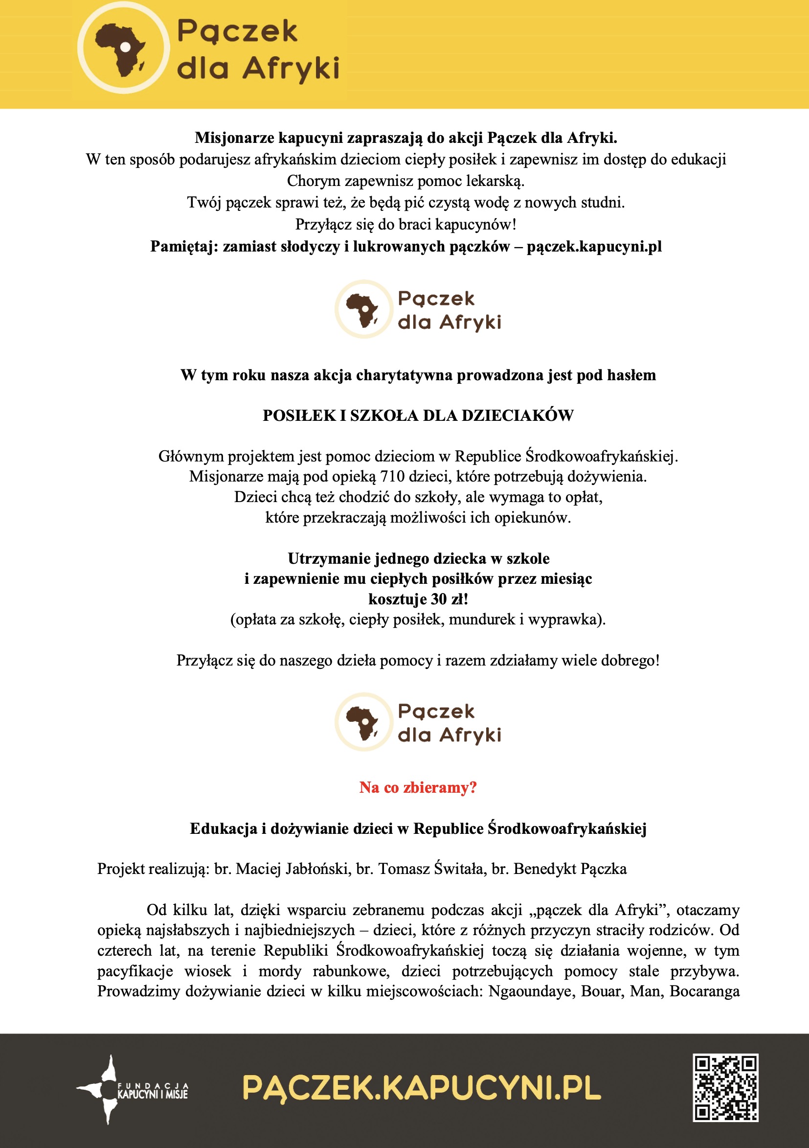 „Przyłącz się do naszego dzieła pomocy i razem zdziałamy wiele dobrego. W ten sposób podarujesz afrykańskim dzieciom ciepły posiłek i zapewnisz im dostęp do edukacji. Chorym zapewnisz pomoc lekarską. Twój pączek sprawi też, że będą pić czystą wodę z nowych studni. Przyłącz się do braci kapucynów! Pamiętaj: zamiast słodyczy i lukrowanych pączków – pączek.kapucyni.pl” – zaalarmowali misjonarze.