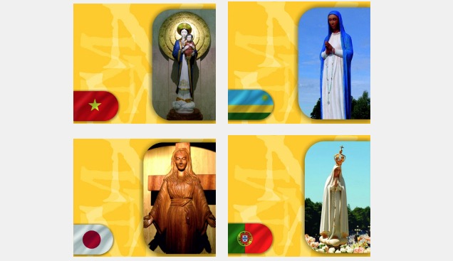 Na planszach obejrzeć można Matkę Bożą z Fatimy w Portugalii, z Częstochowy w Polsce, z Lourdes we Francji, z Oruro w Boliwii, z Wilna na Litwie, z Lwowa na Ukrainie, z Loreto we Włoszech, z Guadalupe w Meksyku, z La Vang w Wietnamie, z Sheshan w Chinach, z Akity w Japonii, z Vailankanni w Indiach, z Aprecida w Brazylii, z El Cobre na Kubie oraz z Kibeho w Rwandzie.