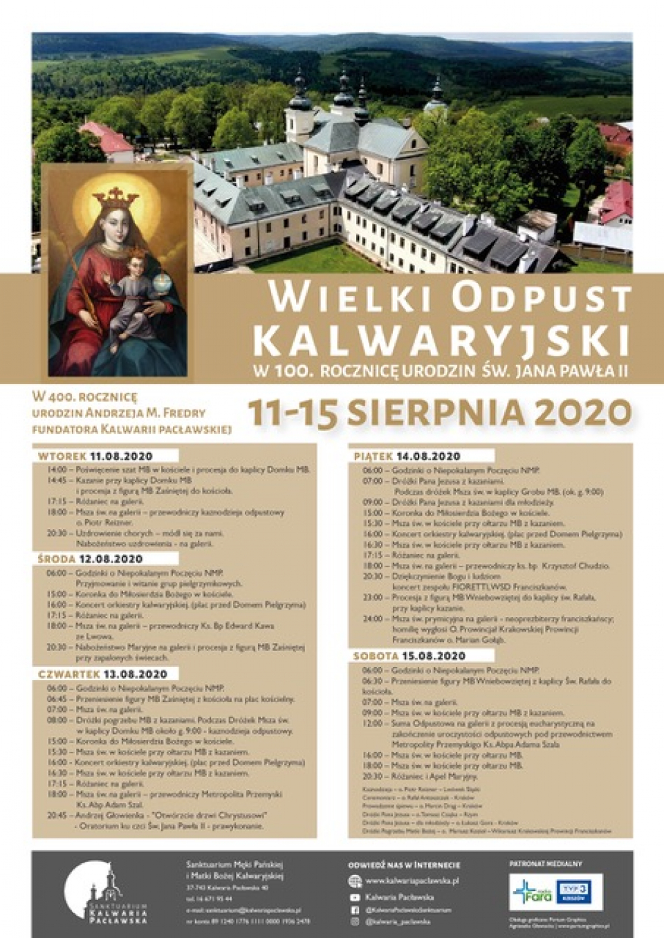 Również razem z nami będą się modlić nasi przemyscy pasterze: abp Adam Szal i bp Krzysztof Chudzio, a ze Lwowa przybędzie bp Edward Kawa. Tegoroczny Wielki Odpust Kalwaryjski pragniemy jeszcze bardziej ubogacić modlitwą, której dzisiaj tak bardzo potrzebuje świat, nasza Ojczyzna i każdy z nas, może jak nigdy do tej pory. Serdecznie zapraszamy do wspólnej modlitwy na Kalwaryjskim Wzgórzu, w czasie Wielkiego Odpustu w dniach 11-15 sierpnia 2020 r. Zostawmy obawy, lęki i niepokoje poza sobą, Bóg jest silniejszy od jakichkolwiek zagrożeń fizycznych, duchowych i moralnych. Niech przyświecają nam słowa św. Jana Pawła II, kiedy rozpoczynał swój pontyfikat: „Nie lękajcie się otworzyć drzwi Chrystusowi”.