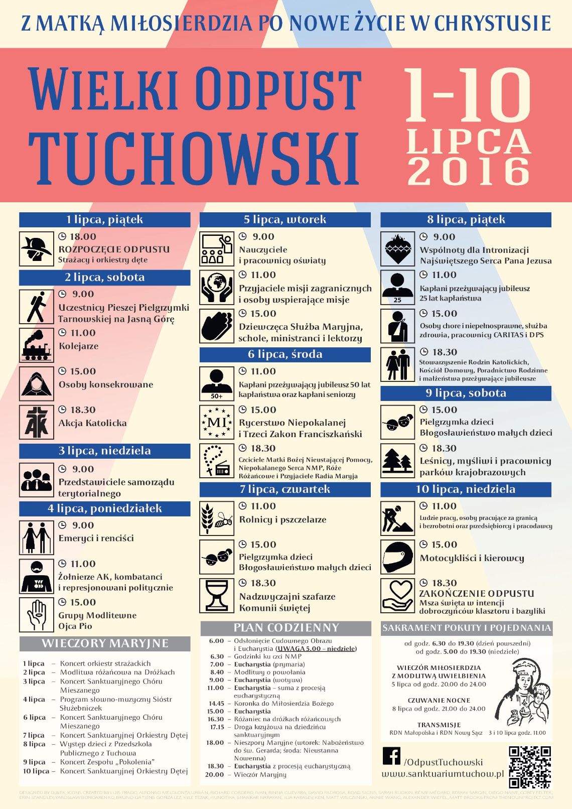 Wielki Odpust Tuchowski trwać będzie do niedzieli 10 lipca. Codziennie będzie można uczestniczyć w Eucharystii, które sprawowane będą o godz. 6.00, 7.00, 9.00, 11.00, 15.00 i 18.30. W niedzielę (3 lipca i 10 lipca) pierwsza Msza Święta będzie już o godz. 5.00.