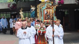 Najświętszą Eucharystię o godzinie 15.15 celebrował i kazanie odpustowe wygłosił ks. bp Antoni Długosz. Na Mszy Świętej zgromadziły się Podwórkowe Kółka Różańcowe Dzieci oraz nasi najmłodsi czciciele Matki Najświętszej wraz ze swoimi rodzicami. Liturgię od strony muzycznej animował zespół „Pokolenia”. Na początku kazania ks. bp Antoni podsumował krótko ostatni czas przeżyty przez najmłodszych. Z wykorzystaniem pomocy wizualnych mówił o I Komunii Świętej, o końcu szkoły i rozpoczęciu wakacji. Wrócił w formie opowiadania do czasów, kiedy rodzice przyjęli sakrament małżeństwa i połączeni miłością dali życie dzieciom. Biskup wskazał, że wiarę tę możemy rozwijać w Kościele, gdzie spotykamy Pana Jezusa, czytając Pismo Święte i spożywając Ciało i Krew Pańską ze stołu Eucharystii.