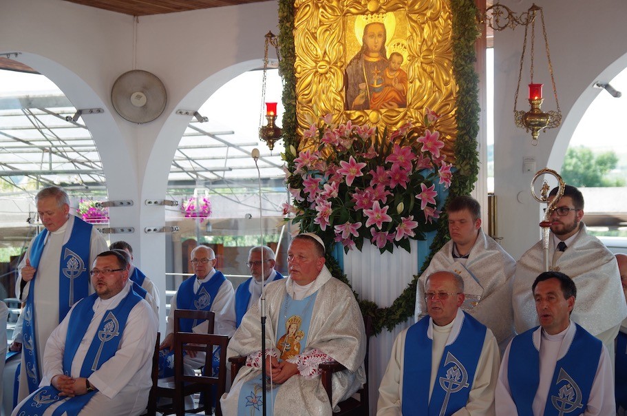 Msza Święta o godz. 15.00, którą poprzedziło wspólne śpiewanie najmłodszych pielgrzymów z tuchowskim zespołem „Pokolenia”, a także koronka do Miłosierdzia Bożego, zgromadziła osoby zaangażowane w Podwórkowe Kółka Różańcowe Dzieci. Głównym celebransem i kaznodzieją był o. Maciej Ziębiec CSsR z Torunia. W liturgii uczestniczyła m.in. Magdalena Buczek, założycielka Podwórkowych Kółek Różańcowych Dzieci. Dialogowana homilia rozpoczęła się oczywiście od pytania o. Ziębca skierowanego do najmłodszych: O czym była dzisiejsza Ewangelia? Było to Słowo o Jezusie, który zgubił się rodzicom w czasie święta. Tak jak Maryja i Józef, Jezusa możemy znaleźć właśnie w świątyni. O. Ziębiec i jego młodsi współbracia, klerycy i postulanci, odegrali też krótką scenkę, w której celebrans poszukiwał ludzi skłonnych do pomocy bliźniemu i do słuchania Słowa Bożego. Scenka pokazała, że wielu ludzi nie chce słuchać Boga, a woli raczej przyziemne rozrywki. Oprócz tego kaznodzieja mówił: czasem przychodzimy do Kościoła jakby Boga w nim nie było. Ilustracją naszego zachowania w świątyni były w kazaniu osoby z zasłoniętymi oczami i z zatkanymi uszami. Redemptorysta na zakończenie rozważania poprowadził krótką modlitwę dzieci i ich rodziców, aby w rodzinach panowała miłość i zgoda. Pod koniec Mszy Świętej głos zabrała również Magdalena Buczek, która zachęciła do tego, by w wakacje nie zaniedbywać modlitwy, zwłaszcza różańcowej. Spotkanie Podwórkowych Kółek Różańcowych Dzieci transmitowało Radio Maryja. Zwieńczeniem tej części dnia odpustowego było błogosławieństwo najmłodszych Najświętszym Sakramentem.