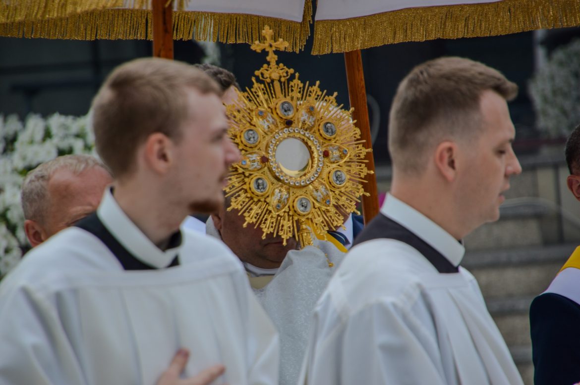 Po uroczystej Mszy Świętej wyruszyliśmy w procesji z Chrystusem obecnym w Eucharystii wokół bazyliki. Ze śpiewem na ustach mogliśmy dziękować Panu Jezusowi za Jego ciągłą pomoc, opiekę i realną obecność pośród nas w znaku chleba.