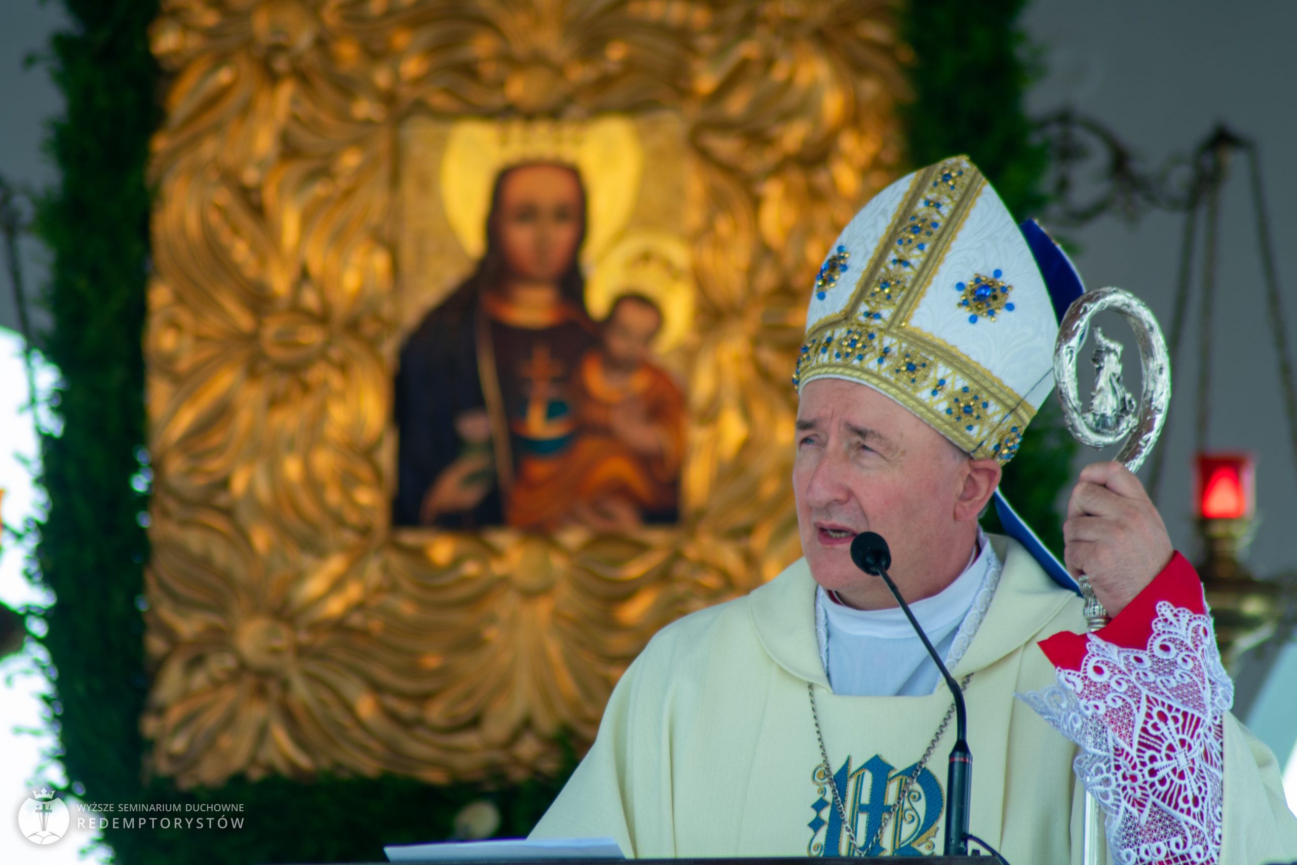 Mszy Świętej o godzinie 9.00 przewodniczył o. Janusz Sok – prowincjał Warszawskiej Prowincji Redemptorystów. On też skierował do wiernych, zgromadzonych na dziedzińcu sanktuaryjnym, słowo homilii. Na początku zaproponował on wiernym wczuć się w rolę Maryi. Ona, podobnie jak Józef, Elżbieta i Jezus – byli ludźmi jak każdy z nas, a więc zarówno radości, jak i trudy przeżywali po ludzku. Maryja w domu Zachariasza i Elżbiety odnalazła azyl i wsparcie, ale ostatecznie wróciła do Nazaretu – do trudnej rzeczywistości. O. Sok zwrócił uwagę słuchaczy jak bardzo boli nas, kiedy nasze oczekiwania są niezaspokojone, kiedy ktoś nas rozczarowuje. Życie ludzkie pełne jest takich rozczarowań, jednak najbardziej boli, kiedy zawodzą nas nasi bliscy. Jednak kiedy człowiek w wolności decyduje się na życie według miłości Bożej, jest w stanie tak jak Maryja przejść przez najgorsze chwile – takie jakimi dla Matki Bożej był Krzyż i Golgota. Siły do prowadzenia życia na wzór Jezusa Miłosiernego daje nam gromadzenie się na liturgii oraz sakramenty: spowiedź, a zwłaszcza Eucharystia, gdzie Jezus karmi nas swoim Słowem i Ciałem. Ojciec Janusz Sok odniósł się też do przykładu kapłanów, w których wierni powinni odnajdywać dobroć i miłość Boga, a co niestety nie zawsze ma miejsce. Jednocześnie zaapelował: masz wokół siebie skarb – swoich bliskich: dzieci, rodziców, rodzeństwo. Dla nich masz być dobry, wierny, pomocny, Boży! To wyzwanie, ale takie, które warto, które trzeba podjąć. Na koniec Mszy Świętej o. Prowincjał w imieniu całej wspólnoty kapłanów, osób konsekrowanych i wszystkich wiernych zawierzył Matce Bożej Tuchowskiej sprawę powołań, nade wszystko powołań kapłańskich, zakonnych i misyjnych. W akcie zawierzenia wspomniana została postać biskupa Leona Wałęgi, który jako pierwszy polecił w tuchowskim sanktuarium sprawę powołań diecezji tarnowskiej i nie doznał zawodu – diecezja tarnowska z pozbawionej nieomal kapłanów stała się jedną z najbardziej zasobnych w kapłanów diecezji nie tylko w Polsce, ale i na świecie.