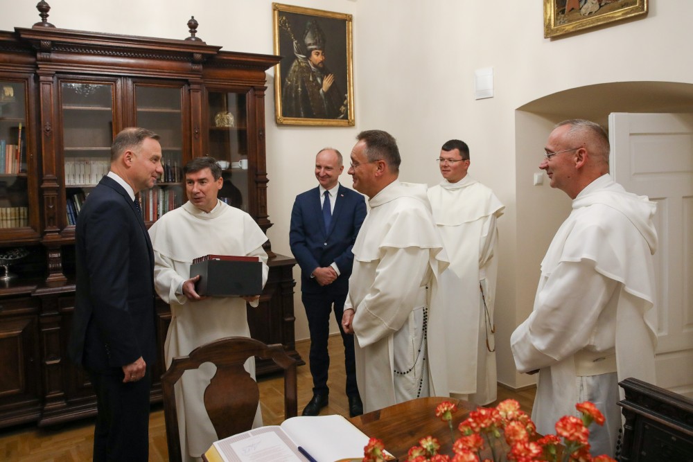 Prezydent Andrzej Duda odbył spotkanie ze wspólnotą zakonników w klasztorze, a później złożył wiązankę biało-czerwonych kwiatów w Krypcie Zasłużonych Twórców Kultury Polskiej przy sarkofagu fundatora klasztoru paulińskiego, ks. Jana Długosza. Następnie w budynku Wyższego Seminarium Duchownego spotkał się z klerykami paulińskimi na wspólnej modlitwie o pokój na Ukrainie. Finałem wizyty Głowy Państwa na Skałce było wystąpienie Prezydenta w parafialnym kościele ojców augustianów pw. św. Katarzyny. Przemówienie miało miejsce przed prapremierowym wykonaniem Oratorium Bachledowiańskiego „Równoj ku Górze”, powstałym dla uczczenia osoby i myśli bł. Stefana Wyszyńskiego – wieloletniego przyjaciela Zakonu Paulinów i częstego gościa na krakowskiej Skałce.