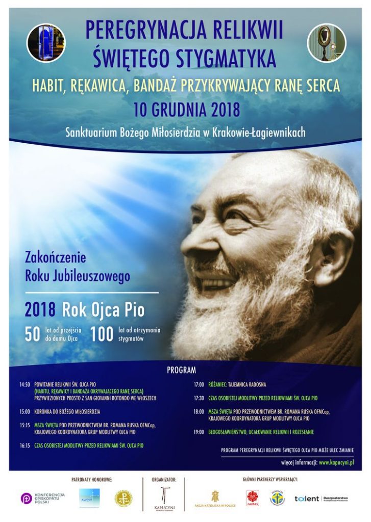 10 grudnia, na zakończenie pielgrzymki po Polsce, relikwie Świętego Ojca Pio zostaną przywiezione do Krakowa i przez kilka godzin będą wystawione w sanktuarium Bożego Miłosierdzia w Łagiewnikach.