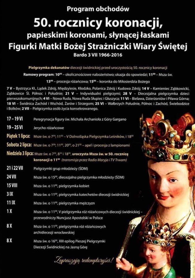 3 lipca 1966 r., w roku Millenium Chrztu Polski, została uroczyście koronowana figurka Matki Bożej Bardzkiej, Strażniczki Wiary Świętej. W tym roku obchodzimy 5o. rocznicę tego wydarzenia. Poniżej zamieszczamy plakat z programem i zapraszamy do Barda!