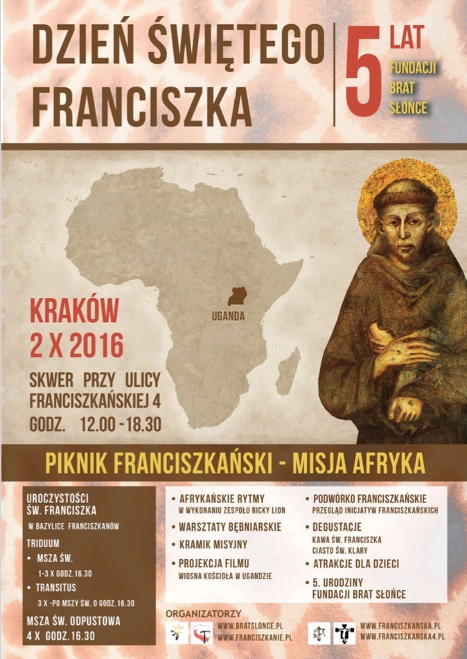 W tym roku swoje 5 urodziny obchodzi franciszkańska Fundacja Brat Słońce. Z tej okazji uczestnicy Dnia Św. Franciszka będą mogli zjeść kawałek urodzinowego tortu i świętować razem z zespołem i wolontariuszami Fundacji. A wszyscy, którzy razem z Fundacją Brat Słońce chcą nieść w świat franciszkańskie pokój i dobro mogą zapisać się w tym dniu do zespołu wolontariuszy. Fundacja przygotowała dla swoich darczyńców niespodzianki – w podziękowaniu za przekazane do puszki datki każdy może wybrać prezent, są wśród nich misyjne kubki i inne przywiezione przez franciszkanów z misji upominki, książki autorstwa franciszkanów oraz inne niespodzianki. Tegoroczna kwesta będzie przeznaczona na franciszkański średniowieczny klasztor w Chęcinach k/Kielc, gdzie trwają prace remontowe i konserwatorskie.