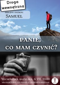 W piątek 6 lipca, podczas Wielkiego Odpustu Tuchowskiego, odbędzie się kolejne czuwanie młodzieżowe z serii „Droga wewnętrzna”. Poprowadzą je neoprezbiterzy redemptoryści. Hasło, oparte na dialogu bogatego młodzieńca z Jezusem (Mt 19, 16-22), brzmi “Panie, co mam czynić?”. Patronat biblijny obejmie Samuel. Wydarzenie rozpocznie się Liturgią słowa z konferencją o godz. 20.00, po której nastąpi wystawienie Najświętszego sakramentu oraz modlitwa uwielbienia Pana Jezusa. Kolejnym punktem będzie Msza Święta o godz. 22.00, która zakończy czuwanie. Serdecznie zapraszamy wszystkich!