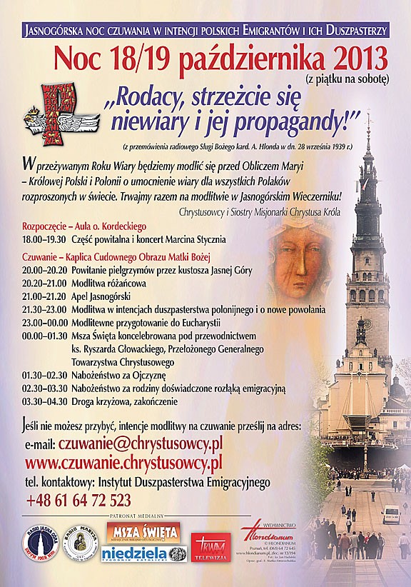 Pragniemy w tę noc 18/19 października dziękować za dar wiary i prosić Boga o umocnienie wierności trawania w Nim na drogach naszego pielgrzymowania – migrowania w świecie.