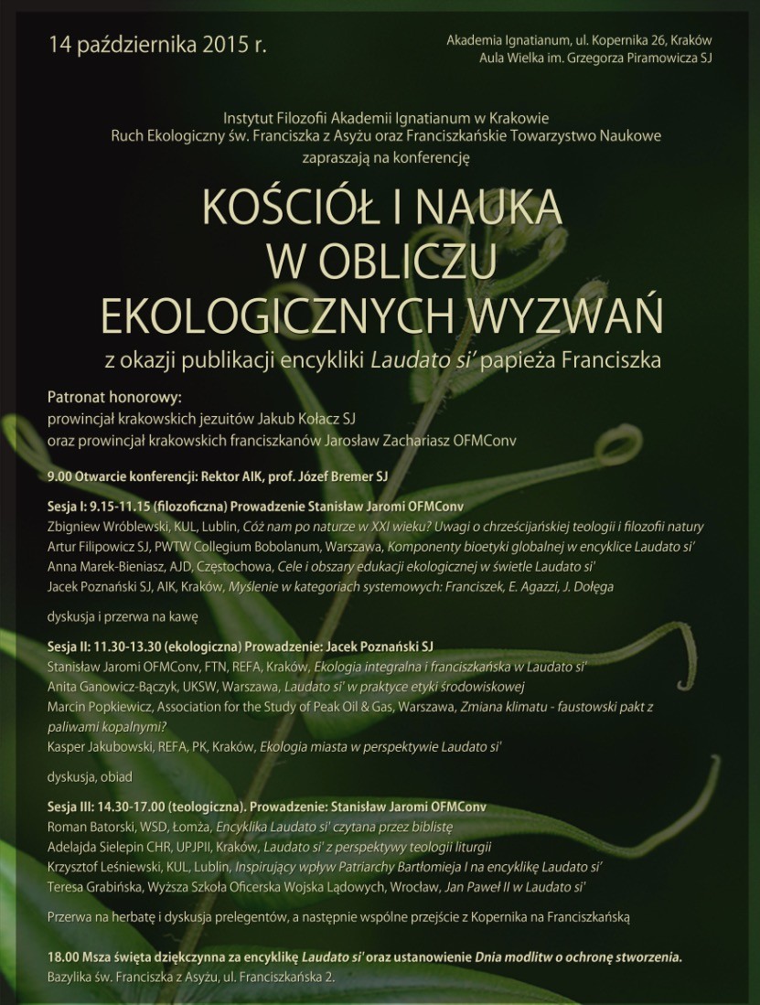 W Krakowie, na Akademii Ignatianum, w dniu 14 października 2015 r., odbędzie się konferencja pt. „Kościół i nauka w obliczu ekologicznych wyzwań”. Honorowym patronatem objęli go prowincjał krakowskich jezuitów o. Jakub Kołacz SJ oraz prowincjał krakowskich franciszkanów o. Jarosław Zachariasz OFMConv.