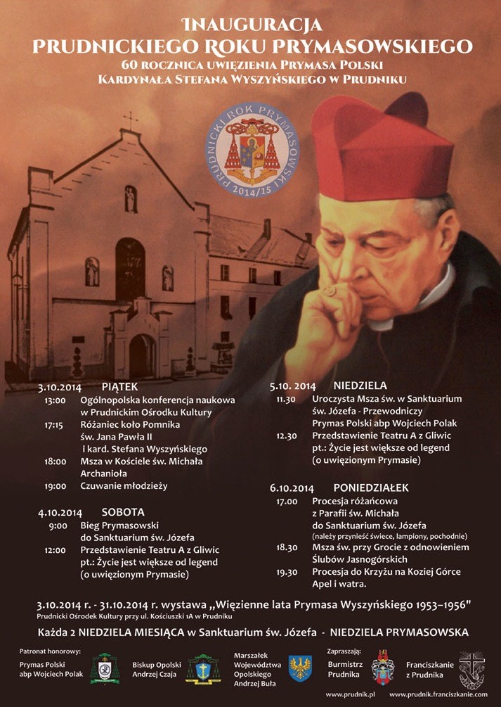 Świadomi wielkiego znaczenia niezłomnej postawy Prymasa Tysiąclecia dla Ojczyzny i Kościoła oraz wagi miejsca, gdzie przebywamy, pragniemy, wraz z Diecezją Opolską oraz władzami samorządowymi, zaprosić serdeczne na inaugurację Prudnickiego Roku Prymasowskiego.