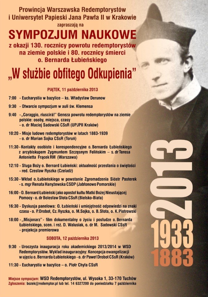 „W służbie obfitego Odkupienia” – to tytuł sympozjum naukowego, które odbędzie się w dniach 11-12 października 2013 r., w auli WSD Redemptorystów w Tuchowie k. Tarnowa. Jest to kolejne wydarzenie w ramach obchodów związanych ze130. rocznicą powrotu redemptorystów na ziemie polskie i 80. rocznicą śmierci Sługi Bożego o. Bernarda Łubieńskiego.