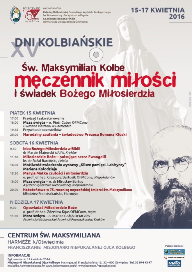 Święty Maksymilian Kolbe męczennik miłości i świadek Bożego Miłosierdzia – to temat XV Dni Kolbiańskich, które odbędą się od 15 do 17 kwietnia 2016 r. w Centrum św. Maksymiliana w Harmężach k. Oświęcimia.
