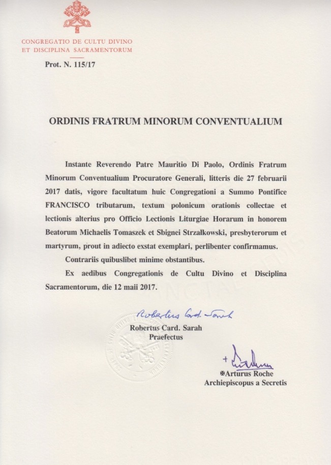 „Na mocy władzy udzielonej tej Kongregacji przez Papieża Franciszka, bardzo chętnie zatwierdzamy tekst polski kolekty i drugiego czytania dla Godziny czytań Liturgii Godzin ku czci błogosławionych Michała Tomaszka i Zbigniewa Strzałkowskiego, prezbiterów i męczenników, jak to jest przedstawione w załączniku. Bez względu na jakiekolwiek przeciwne rozporządzenia” – napisali Prefekt Kongregacji Robert kard. Sarah i Arcybiskup Sekretarz Artur Roche.
