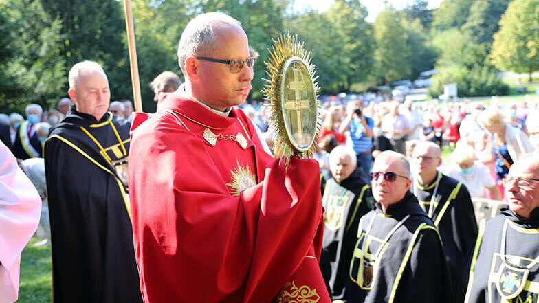 Aż do dziś kontynuujemy tę rewitalizację Świętego Krzyża, której jesteście świadkami, dzięki dotacjom Unii Europejskiej, Ministerstwa Kultury i Waszej pomocy. W 2013 roku, gdy na ukończeniu była już odbudowa wieża na kościele, papież Benedykt XVI ogłosił kościół Trójcy Świętej bazyliką mniejszą, a kilka lat później Prezydent RP, Pan Andrzej Duda, świętokrzyskie wzgórze objął swym patronatem i ustanowił Pomnikiem Historii – mówił do pielgrzymów o. Marian Puchała OMI – I mamy nadzieję, że już wkrótce dokona się sprawiedliwość dziejowa, że wreszcie po 30 latach starań klasztor powróci w swe odwieczne granice, że “szpitalik” i skrzydło zachodnie znajdą się w granicach zespołu klasztornego, jak dawniej, i Sanktuarium będzie mogło wreszcie normalnie funkcjonować, służyć Bogu i ludziom. Dziękujemy Wam Siostry i Bracia, przybyli z bliska i z daleka, za modlitwę w tym miejscu, za ciągłe zainteresowanie naszymi dziejami, za wasze wsparcie duchowe i materialne, za ofiarowane cierpienia, by nasze Sanktuarium istniało nadal i żyło, by było coraz piękniejsze, jak widać, by cieszyło oczy i serca, i by już nikt nigdy nie podnosił ręki na to dzieło Bożej mocy, które przetrwało tyle wieków i pokoleń, tyle lat hańby, upokorzeń i kaźni.