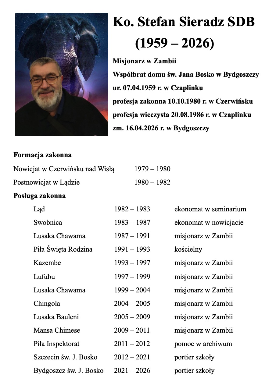 Z żalem informujemy, że dzisiaj 16.04.2026 r. w godzinach wieczornych zmarł nasz współbrat, koadiutor Stefan Sieradz SDB ze wspólnoty św. Jana Bosko w Bydgoszczy.