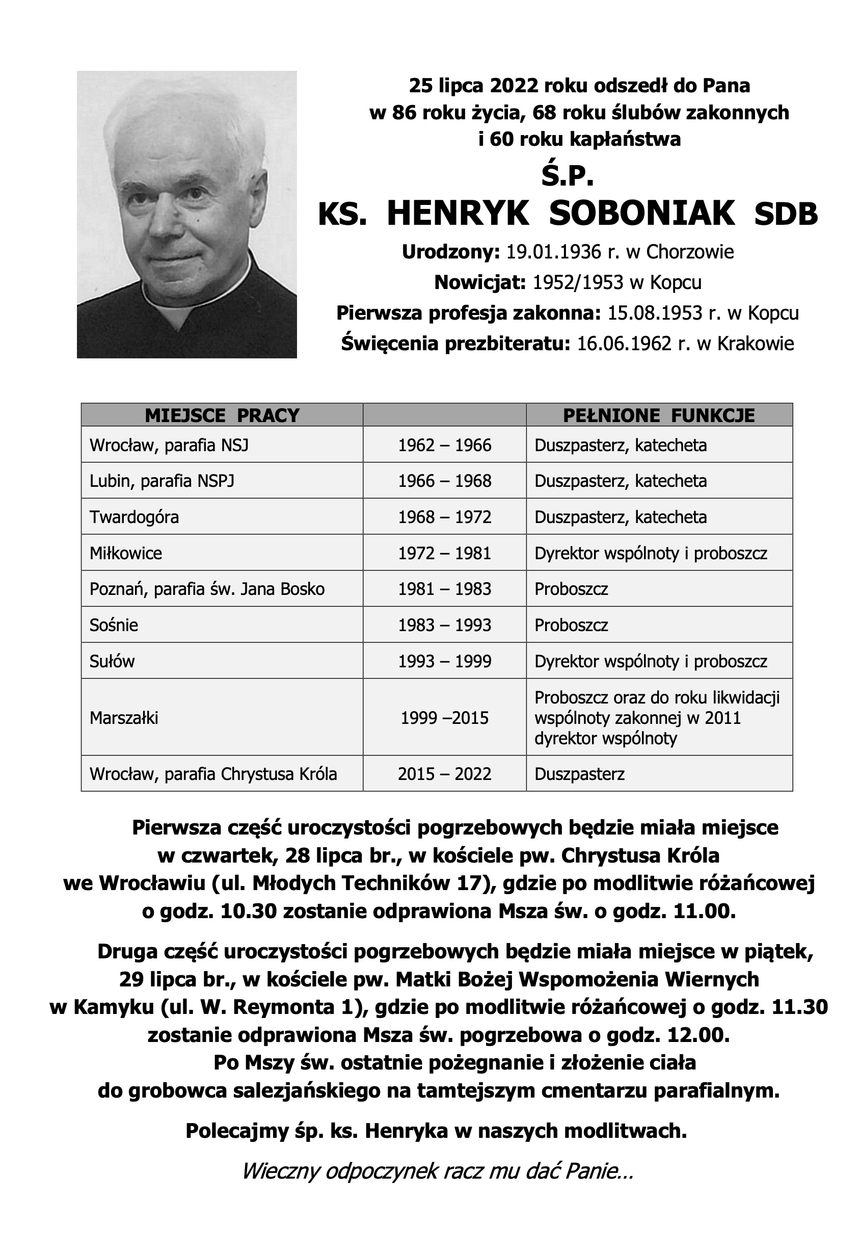 25 lipca br., w godzinach przedpołudniowych w szpitalu we Wrocławiu, w 86 roku życia, odszedł do Pana śp. ks. Henryk Soboniak sdb.
