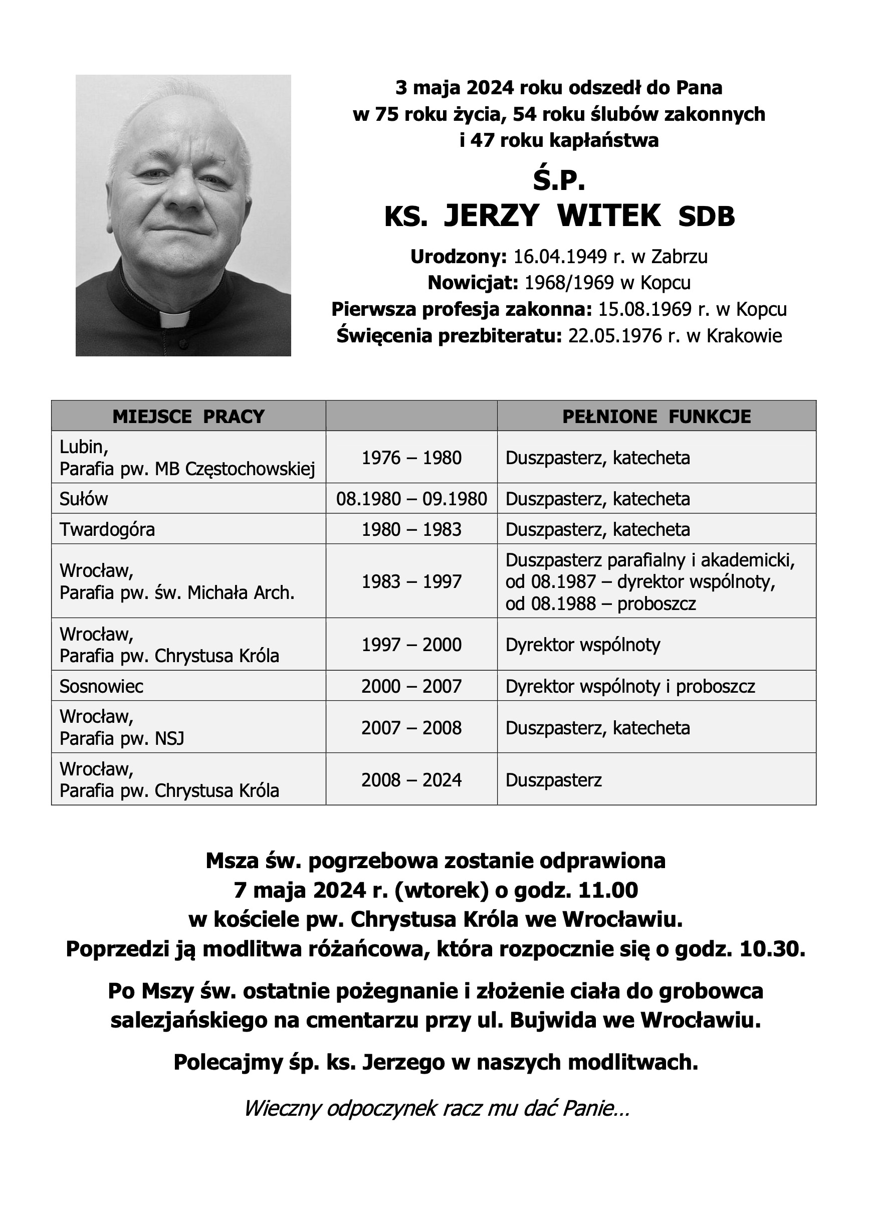 3 maja 2024 roku odszedł do Pana w 75 roku życia, 54 roku ślubów zakonnych i 47 roku kapłaństwa śp. ks. Jerzy Witek sdb
