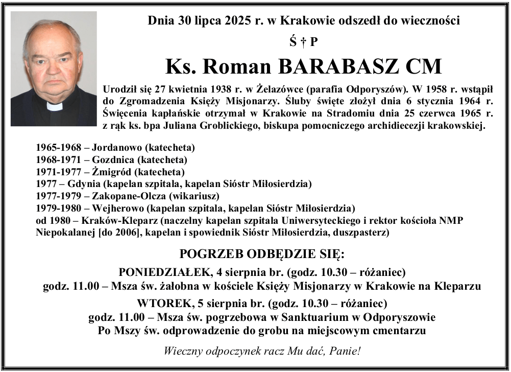 Informacje o pogrzebie śp. ks. Romana Barabasza CM: