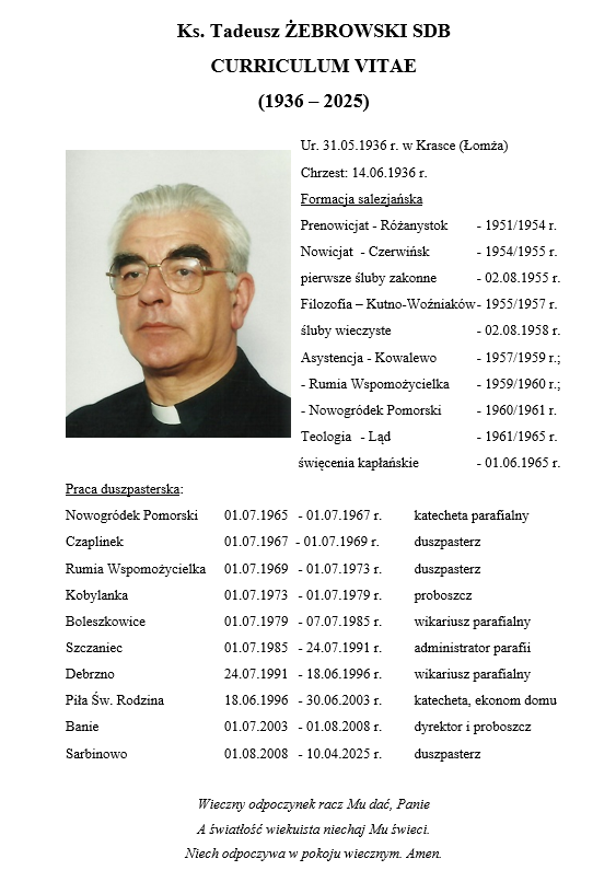 Z żalem informujemy, że dnia 07.04.2025 r. w zmarł ks. Tadeusz Żebrowski – salezjanin pracujący w parafii pw. Wniebowzięcia NMP w Sarbinowie.