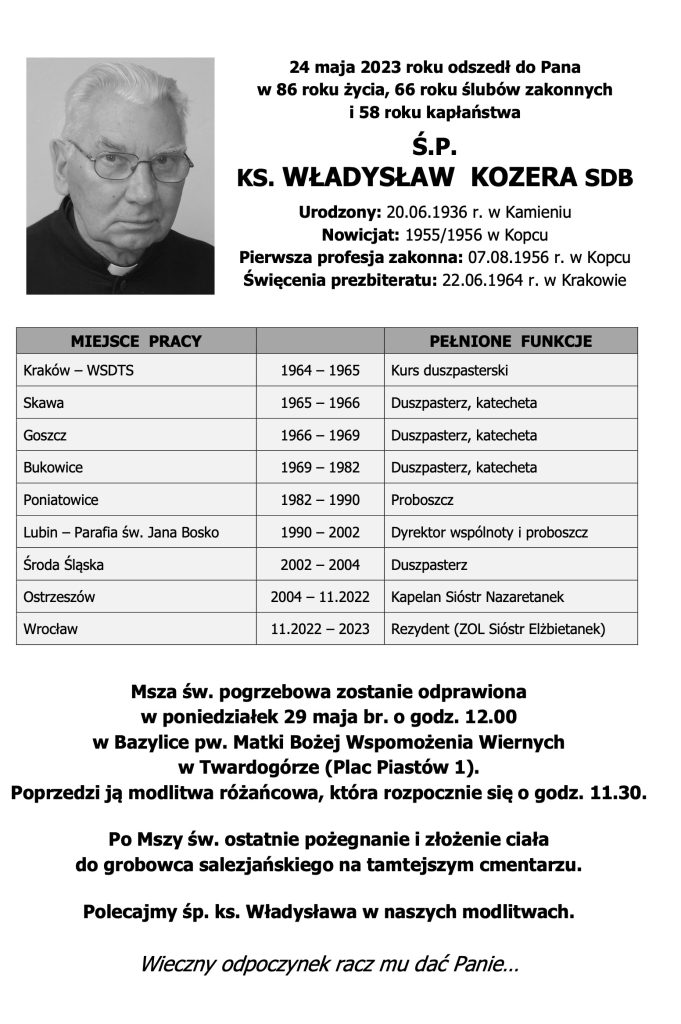 24 maja 2023 roku odszedł do Pana w 86 roku życia, 66 roku ślubów zakonnych i 58 roku kapłaństwa śp. ks. Władysław Kozera sdb