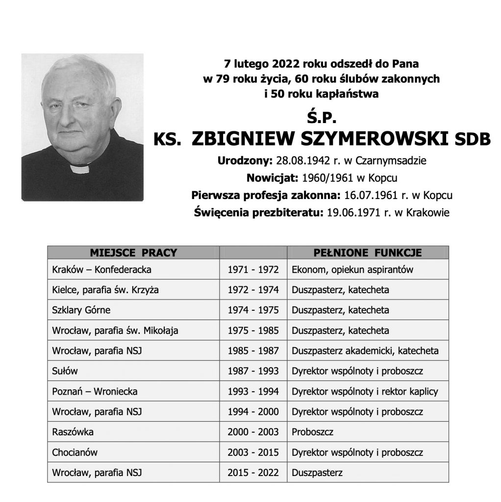 7 lutego 2022 r., w godzinach wieczornych, w naszym domu zakonnym we Wrocławiu, w 79 roku życia, odszedł do Pana śp. ks. Zbigniew Szymerowski.