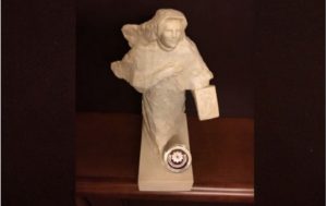 Figurkę ze sztucznego kamienia, a dokładniej połączenia mączki marmurowej i żywicy epidianowej, wykonała Krystyna Fałdyga-Solska, absolwentka Akademii Sztuk Pięknych w Krakowie i rzeźbiarka mieszkająca i pracująca w Łodzi. Jest ona autorką licznych pomników o tematyce sakralnej, m.in. św. Jana Pawła II, św. Maksymiliana Kolbe i św. Faustyny Kowalskiej.
