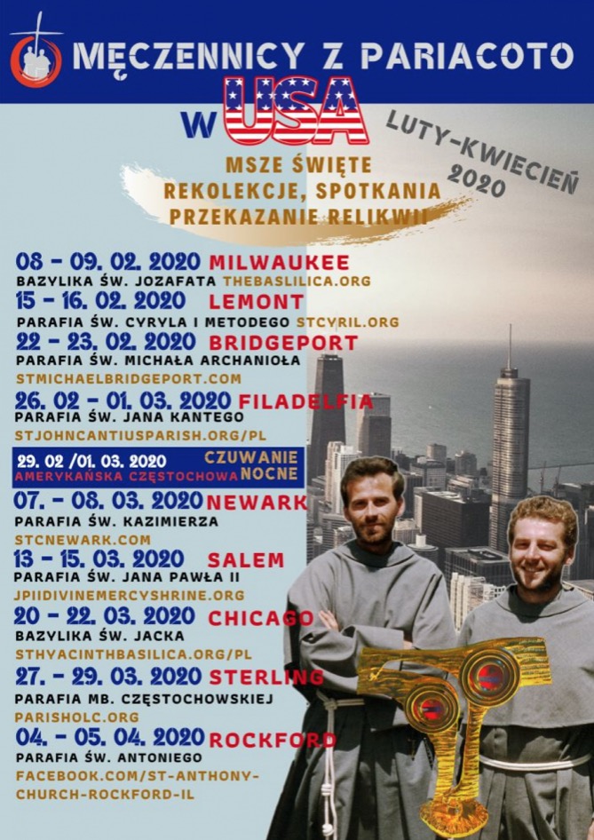 Milwaukee, Lemont, Bridgeport, Filadelfia, Amerykańska Częstochowa, Newark, Salem, Chicago, Sterling, Rockford – po raz kolejny relikwie Męczenników z Pariacoto trafią do parafii i kościołów za oceanem, a wierni ze Stanów Zjednoczonych będą mogli uczestniczyć w nabożeństwach, rekolekcjach i spotkaniach, na których będą także obecne relikwie I stopnia Błogosławionych Męczenników.