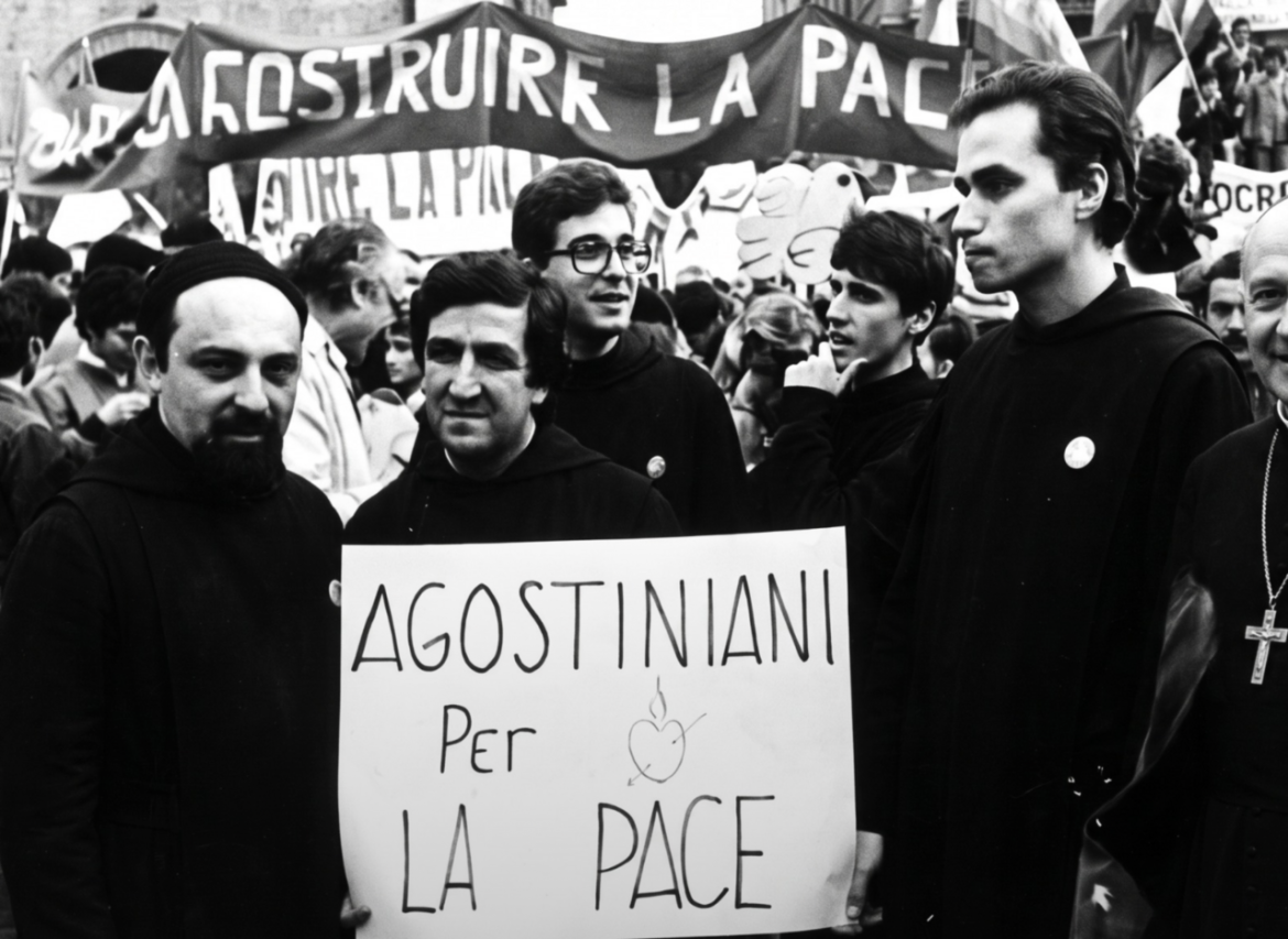 Na zdjęciu, wraz z innymi augustiańskimi współbraćmi, widać o. Roberta Prevosta – świeżo wyświęconego i studiującego wówczas prawo kanoniczne. Maszeruje pod sztandarem młodych augustianów na rzecz pokoju. O. Prevost miał wówczas 27 lat.