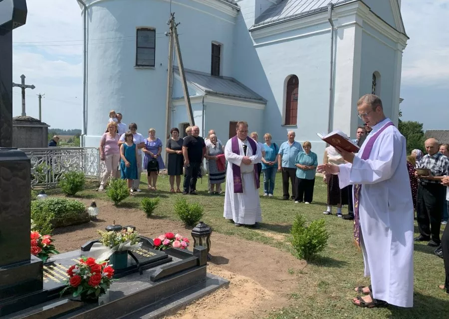 Na zakończenie Mszy św. ks. Artur ponownie zwrócił się do wiernych, prosząc ich, aby nie zapominali o dobrej tradycji istniejącej w Wiszniewie, „aby grób o. Stanisława był zawsze miejscem modlitwy o święte powołania”. Po Mszy św. o. Viktor Zhuk SJ poświęcił nowy pomnik i poprowadził modlitwę o nowe powołania.