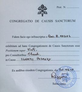 20 czerwca 2018 roku ks. Bogusław Kozioł SChr, postulator procesu Sługi Bożego Ojca Ignacego Posadzego złożył w Kongregacji Spraw Kanonizacyjnych w Rzymie napisane przez niego „Positio super vita, virtutibus et fama sanctitatis”. Tym samym zakończył się kolejny etap procesu Ojca, polegający na krytycznym opracowaniu życia i cnót Sługi Bożego.