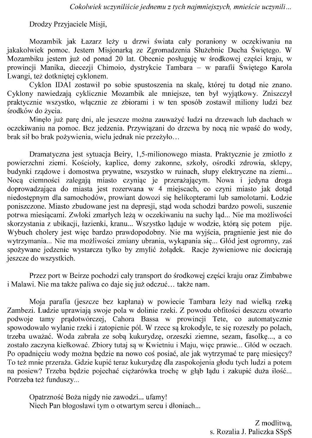 W Mozambiku Cyklon zmiótł miasto Beira z powierzchni ziemi. Brakuje wody, jedzenia, prądu, bezpiecznego schronienia. Caritas Polska we współpracy ze światową siecią Caritas ruszyła z pomocą poszkodowanym przekazując 100 tys. złotych. Apeluje także o modlitwę i dalszą pomoc finansową poprzez SMS charytatywny o treści: „MOZAMBIK” pod nr 72052 (koszt: 2,46 zł z VAT).