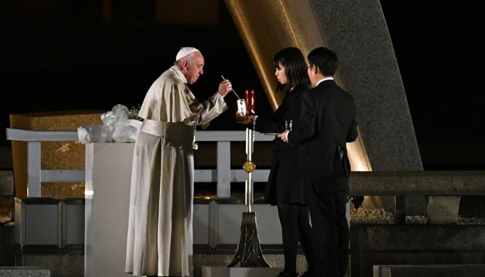 Ojciec Święty przyleciał do Hiroszimy z Nagasaki. Z lotniska przejechał samochodem pod Pomnik Pokoju, zbudowany w miejscu wybuchu bomby. Powitały go tam władze miasta. Franciszek wpisał się do księgi honorowej. – Przybyłem jako pielgrzym pokoju, by przeżywać żałobę w solidarności ze wszystkimi, którzy doznali obrażeń i śmierci w tym straszliwym dniu w historii tej ziemi. Modlę się, by Bóg życia nawrócił serca na pokój, pojednanie i braterską miłość – napisał papież.