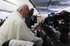 Przechodząc między fotelami samolotu Franciszek otrzymywał prośby o modlitwę za chorych, listy i bilety oraz rozdawał różańce. Kamerzysta „Rome Report” poinformował Franciszka, że niebawem planuje ślub, na co papież zareagował żartem: „Oto kolejny …” a potem udzielił błogosławieństwa i wręczył dwa różańce czarny dla niego a biały dla narzeczonej, która pozostała we Włoszech.